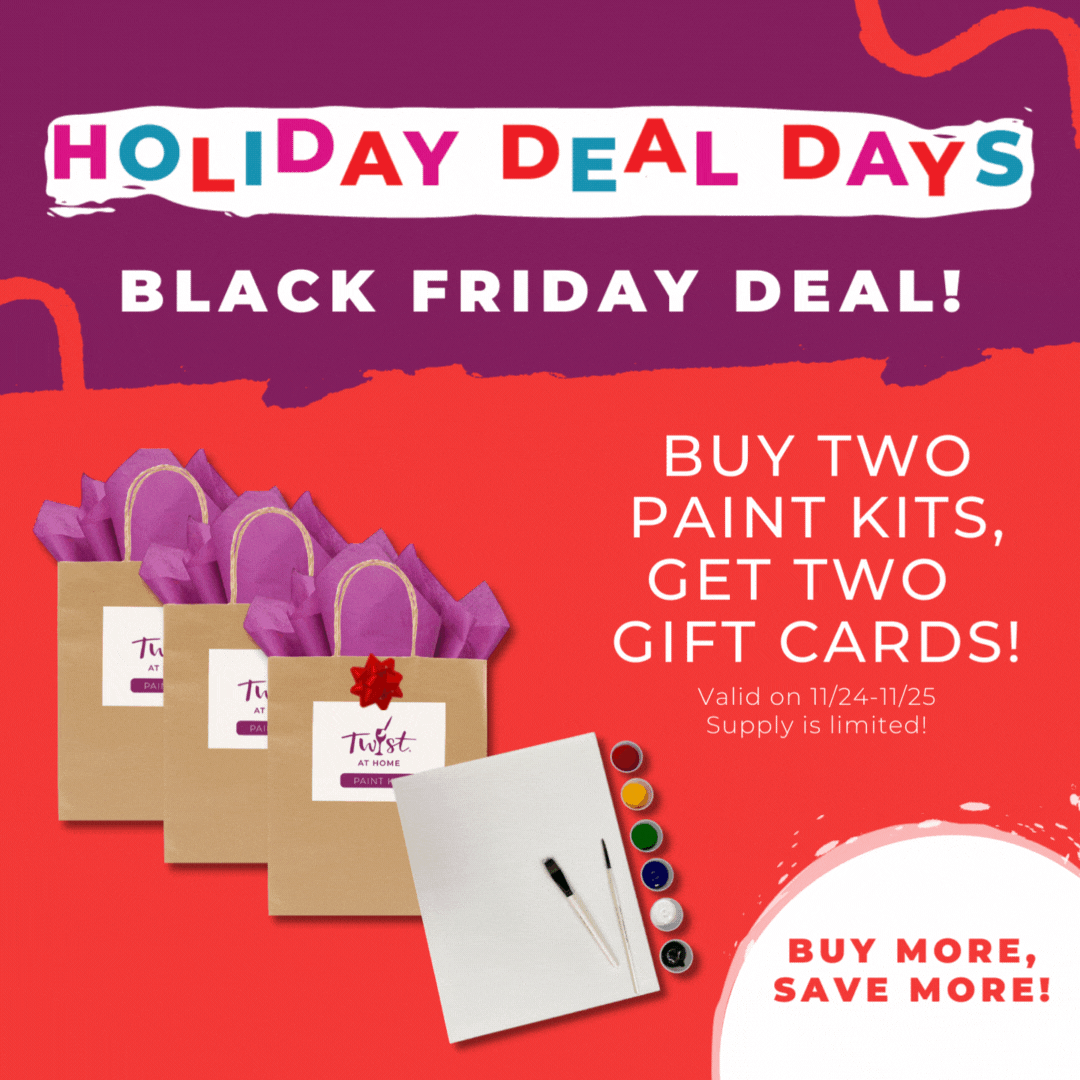 Black Friday deals are here and you don't want to miss out! Our Twist at Home kits are on sale and perfect for gifting. Kits come with everything you need to create-- whenever, wherever. Your gift recipient will get to choose what they want to paint from 100s of options! Plus, the more you buy, the more you save! Buy two kits and you'll get two gift certificates of equal value for free. Save them for yourself of gift them!