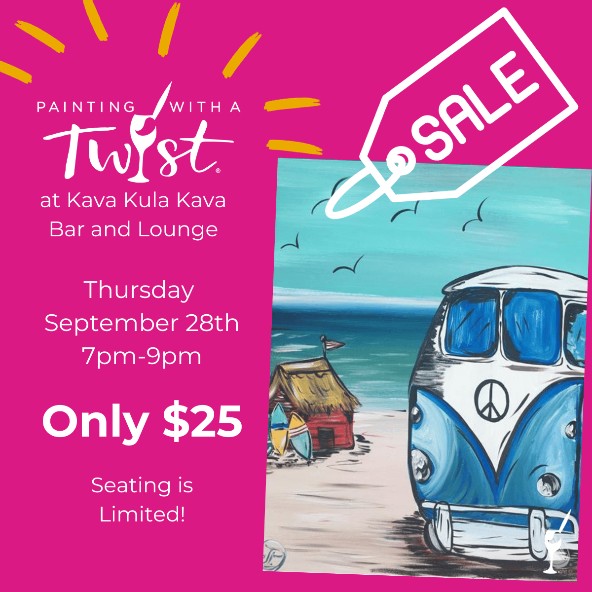 Painting with a Twist-Daytona Beach is going on the road! Join us for this adorable Beach Bum painting at Kava Kula Kava Bar and Lounge in Ormond Beach. Paint with us and sip and learn about Kava (a drink made from the root of a kava plant with sedative, anesthetic, and euphoric properties). And Kava Kula Kava Bar is offering this event at a $20 discount, so you only pay $25! There’s still time to take advantage of this offer!
